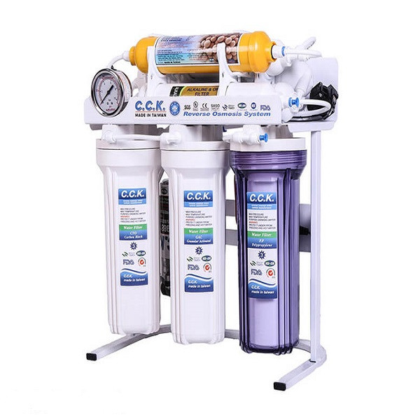 دستگاه تصفیه آب 6 مرحله ای c.c.k از محبوب ترین دستگاه های تصفیه آب خانگی است که با 6 مرحله تصفیه کامل با تصفیه کنندگی 99.9 درصدی املاح محلول در آب با قطر 1 تا 5 میکرون که علاوه بر حذف شوری آب ، مشکل بوی نامطبوع آب ، کلر موجود در آب ، و حذف کامل جرم کتری را بدرستی انجام می دهد . این دستگاه علاوه بر دارا بودن فیلتر ممبران جهت کاهش سختی آب ناشی از انواع نمک های معدنی و آلی ، فلزات سنگین ، ترکیبات نیترات دار ، حذف کامل یاخته های زنده مانند انواع ویروس و باکتری ، قابلیت معدنی کنندگی را هم دارد . به این صورت که با اضافه کردن مواد معدنی مفید برای بدن انسان به میزان مورد نیاز ، باعث می شود تا همیشه آبی را نوش جان بفرمائید که مقادیر متناسبی از انواع مواد معدنی مانند : پتاسیوم ، روی ، آهن و فسفر را در طول روز و فقط با نوشیدن آب در یافت نمائید . این دستگاه در شرکت جوی واتر با قطعات دارای گرید استانداد خوراکی یا همان food grade تولید شده است. یک شیر برداشت اهرمی استیل جهت نصب روی سینک نیز به همراه این دستگاه ارائه می گردد . مخزن تحت فشار دستگاه تصفیه آب سی سی کا به شما کمک می کند که علاوه تحویل آب با فشار مناسب روی سینک ، در مواقعی مانند قطع برق ، حدود 8 لیتر آب شرب ذخیره شده داشته باشید .